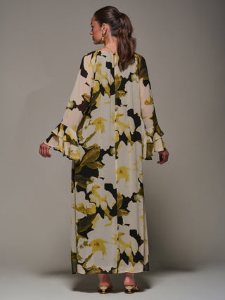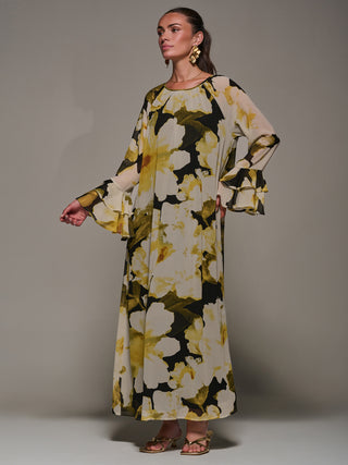 Angel Sleeve Draped Mesh Maxi Dress, Orange Floral
