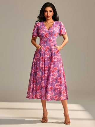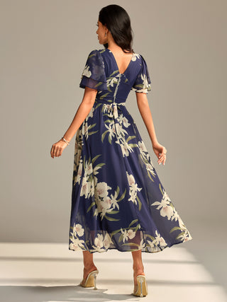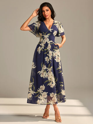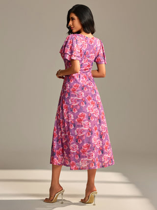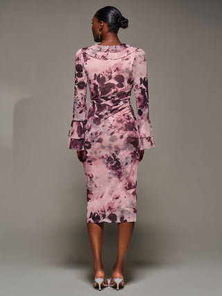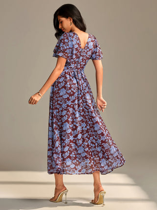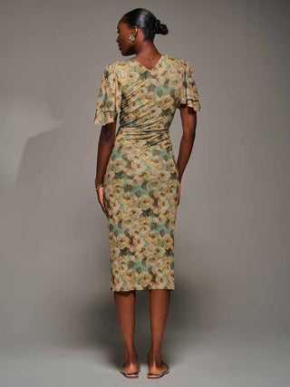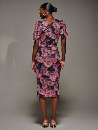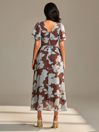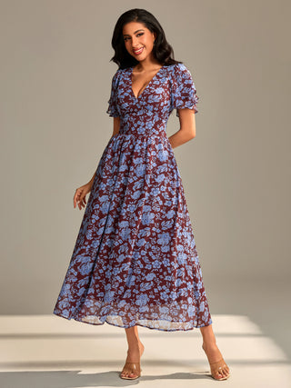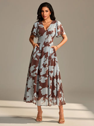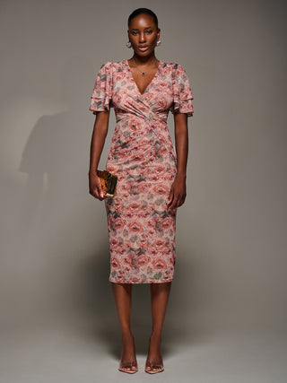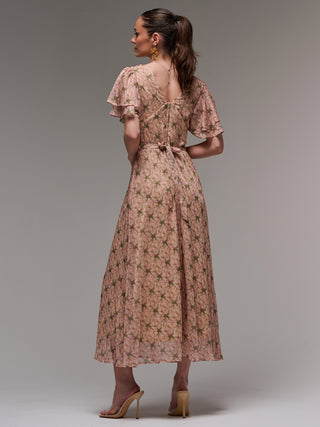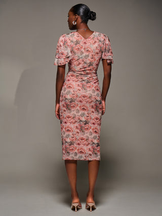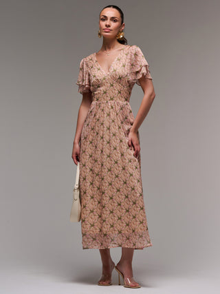 Mesh Short Sleeve Midaxi Dress, Brown Floral