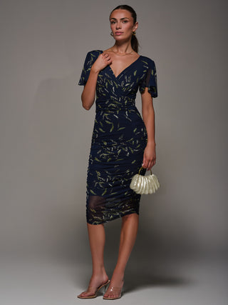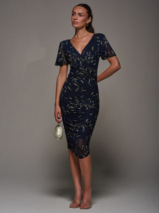 Angel Sleeve Ruched Bodycon Dress, Navy Leafy