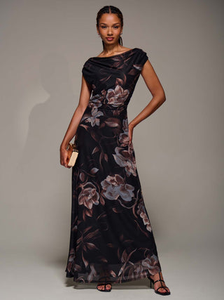 Asymmetric Draped Mesh Maxi Dress, Pink Abstract