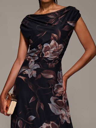 Asymmetric Draped Mesh Maxi Dress, Khaki Abstract