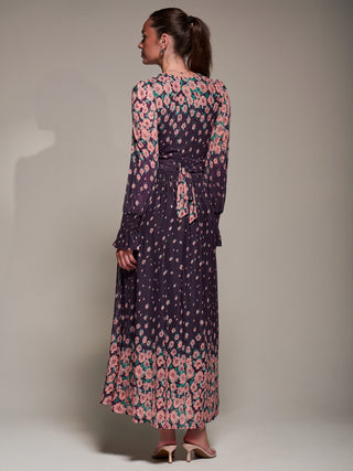 Mirrored Print Long Sleeve Mesh Maxi Dress, Purple Floral