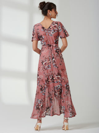 Cross Over Tie Waist Maxi Dress, Pink Multi