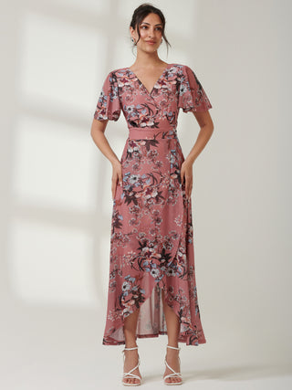 Printed Mesh Frill Dip Hem Dress, Pink Floral