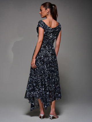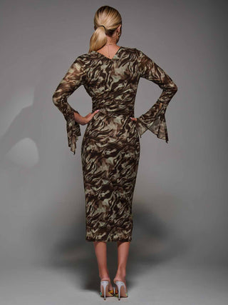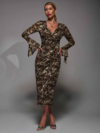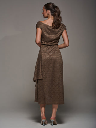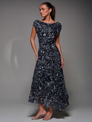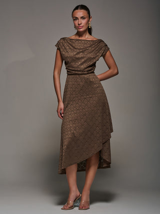 Asymmetric Draped Mesh Maxi Dress, Khaki Abstract