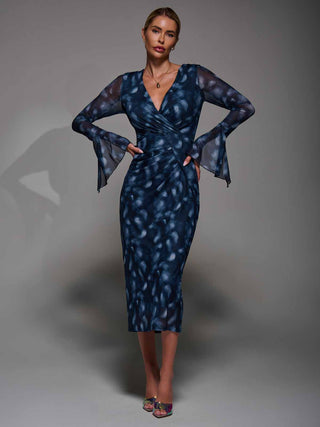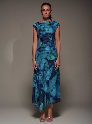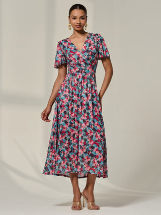 Floral Mirror Mesh Wrap Maxi Dress, Blue Floral