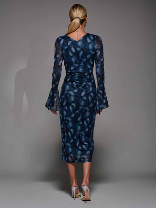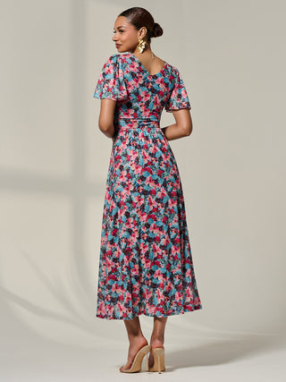 Shirred Ruffle Sleeve Tiered Midi Dress, Navy Floral