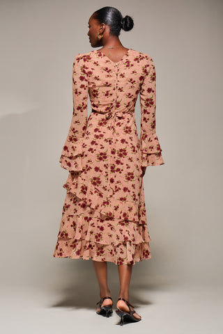 Ruffled Long Sleeve Tiered Chiffon Midaxi, Pink Floral