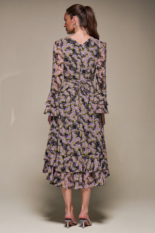 Long Sleeve Frill Chiffon Midaxi Dress Black Floral