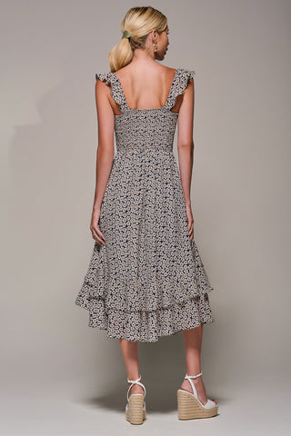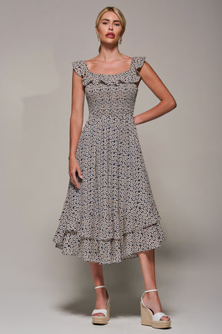 Shirred Ruffle Sleeve Tiered Midi Dress, Navy Floral