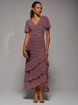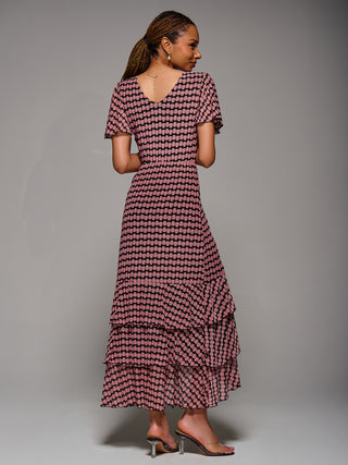 Geo Print Tiered Maxi Dress, Pink Geo