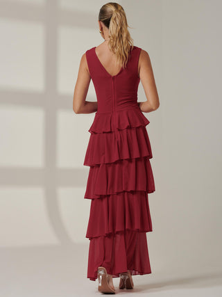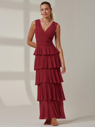 Mesh Sleeveless Tiered Maxi Dress, Burgundy