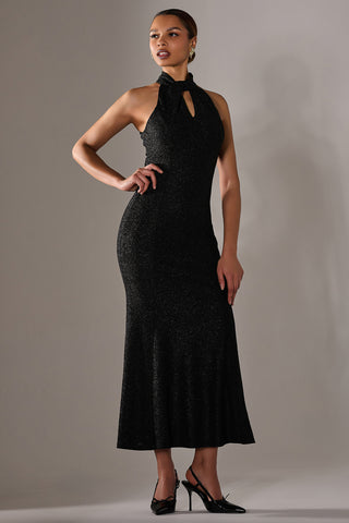 Sequin Asymmetric Ruffle Hem Maxi Dress, Black Gold