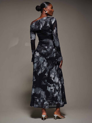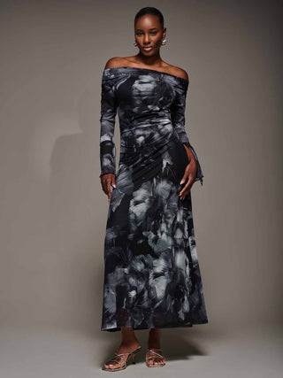 Long Sleeve Slash Neck Maxi Dress, Black Abstract