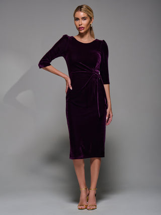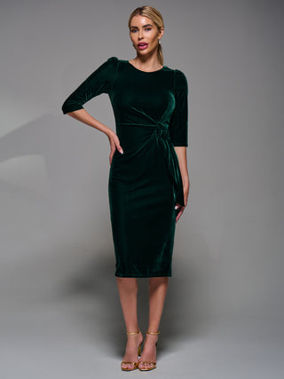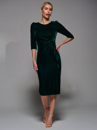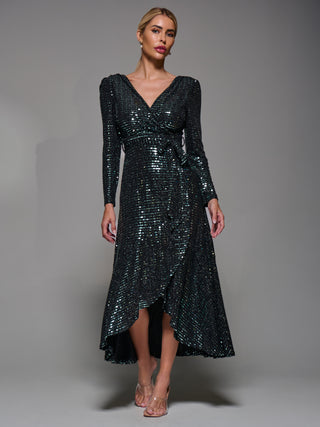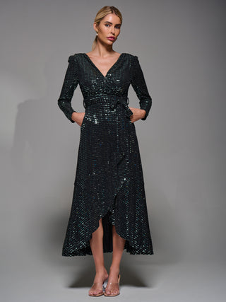 Puff Sleeve Metalic Spot Print Dip Hem Midi Dress Dark Green