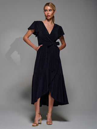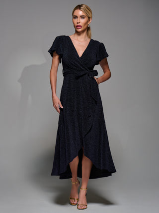 Sequin Angel Sleeve Ruffle Hem Maxi Dress, Black Purple