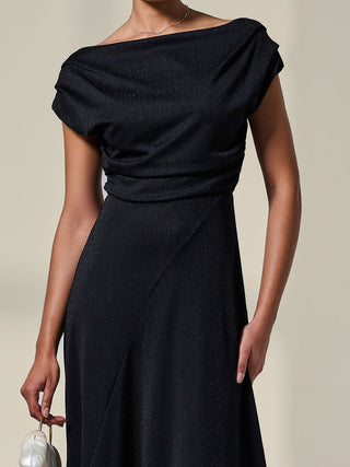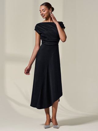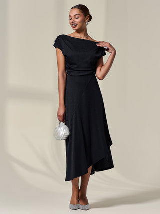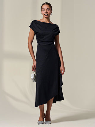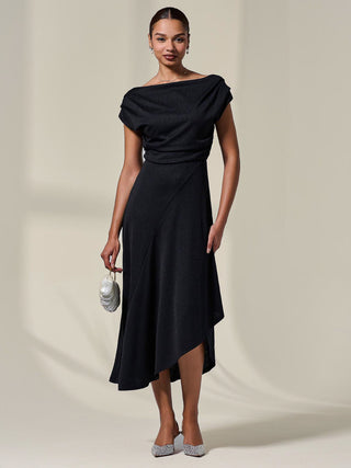 Sophisticated and elegant, the Asymmetric Draped Midi Dress by Jolie Moi will make you feel your best, with its floaty silhouette and unique pleated neckline, which can be worn in multiple ways, whether that be off the shoulder or as a more cowl neck style. Its asymmetric wrap hem adds an element of fun to this stylish piece, whilst the length keeps in classy. The shimmers in the fabric would make this dress the perfect evening piece, whilst also being comfortable.