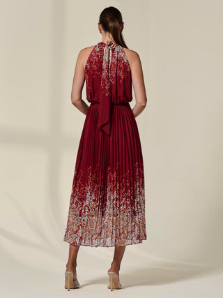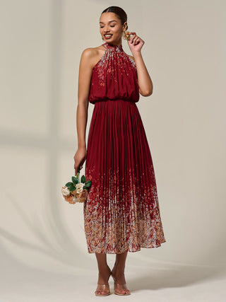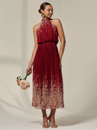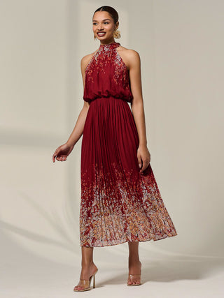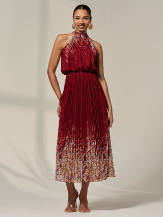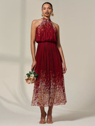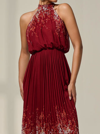 Pleated Halterneck Maxi Dress, Red Floral